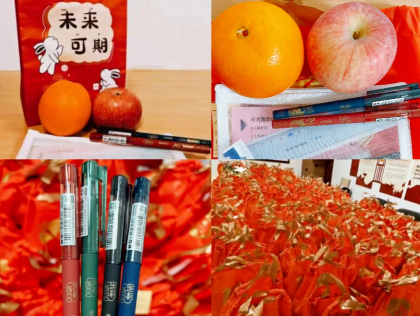 印有“未来可期”字样的礼袋中有脐橙、文具套装、印有“一举夺魁”“旗开得胜”“鲤跃龙门”等字样的故宫文化联名金榜题名笔、苹果等,“红红火火”的手提袋承载着“未来可期”“好运满满”的祝福,金色的橙子预祝所有考研学子一举“橙”名、马到“橙”功、“‘橙’功上岸”,苹果寓意考研学子“苹”步青云、“苹”安顺遂、一马“苹”川出成“果”,文具套装祝愿考研学子在考场泼墨挥洒,下笔如有神助,描绘锦绣前程。满满的心意体现了公司对于考生满满的期望与祝福,希望同学们保持积极心态、科学安排作息、注意营养饮食,以最好的状态迎接考试的检验,脚踏实地,一步一个脚印,走向自己期许的未来。