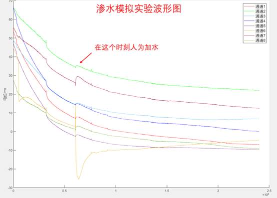 最终,我们如愿以偿的得到了隧道中的自然电位数据,且人为模拟渗水情况的自然电位波形与我们在实验室里得到的自然电位数据波形十分接近。