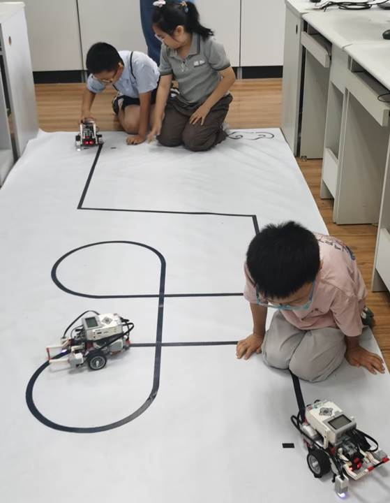 活动中,公司赵璐老师以生动有趣的方式开启教学,先带领孩子们认识乐高 EV3 机器人的核心部件,指导孩子们精准标记各部件与 EV3 程序块的连接端口,随后通过深入浅出的讲解,让孩子们快速掌握了基础编程方法。实践挑战环节中,在基础部教师及员工志愿者的指导下,孩子们分组投入 “小车任务”:圆满完成 “悬崖勒马”、“循迹行走”、“障碍刹车”等任务,现场气氛热烈。基础部的教师充分发挥专业优势,全程参与指导,帮助孩子们在机器人搭建与编程中锻炼逻辑思维、空间想象力和团队协作能力。