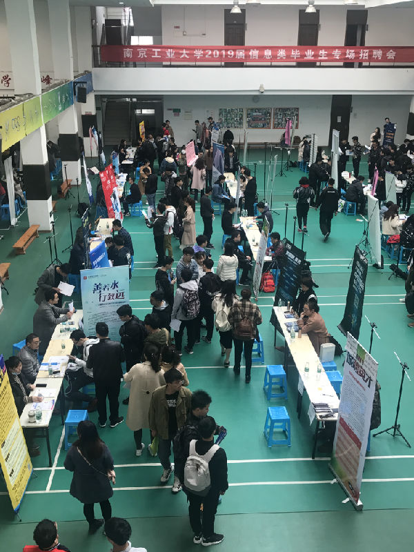 本次招聘会共吸引逾100家优秀企业参展,其中既有中国电子科技集团公司第十四研究所、第五十五研究所、中邮建有限公司等大型国有企业以及学而思教育、上海汉得等上市公司,也有小鹿创萌、南京中软软件与服务有限公司等南京本土企业。招聘会吸引到本校计算机、电控、数理以及经管公司的众多毕业生,更有周边兄弟院校毕业生到场求职,同时也有部分低年级同学前来提前了解就业形势。招聘会现场人头攒动,气氛热烈,秩序井然,每位应聘者都手持自己精心准备好的自荐书和简历穿梭于人流之中,积极与招聘人员交流,到自己感兴趣的公司展位前应聘。