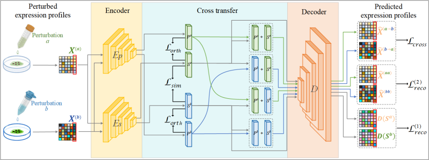 研究团队创新性地提出了一个跨域交叉迁移学习框架(图1),该框架能够有效学习药物与基因扰动表征,并迁移至新的细胞环境中,从而预测扰动诱导的表达谱。XTransferCDR的核心在于其独特的特征解耦-交叉迁移架构,其中包含细胞基态特征编码器、扰动态特征编码器、特征交叉迁移模块和表达谱生成器。在理论上,该模型借鉴了解耦表征学习、线性可加性、特征迁移的思想,通过这种设计,模型能够充分捕获药物扰动和细胞系之间的复杂相互作用。实验结果表明,在单细胞药物扰动、单基因扰动和双基因扰动数据集上,XTransferCDR都展现出了优异的预测性能。这项研究为药物开发领域提供了一种新的计算工具,帮助研究人员有效地地预测药物诱导的分子表型反应,从而加速药物筛选过程。