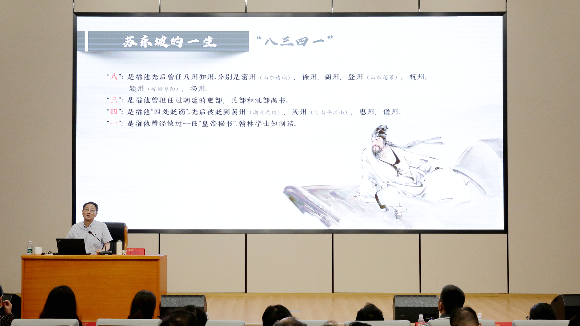 主讲嘉宾汪维宏以《千载浩然:从苏轼到东坡的廉政人生》为题,深入剖析了苏东坡的生平与廉政思想。他通过“拒贿修堤”“简政惠民”等历史典故,生动展现了苏东坡“民本思想”与“廉洁从政”的高度统一,为现场师生上了一堂深刻的廉政教育课。