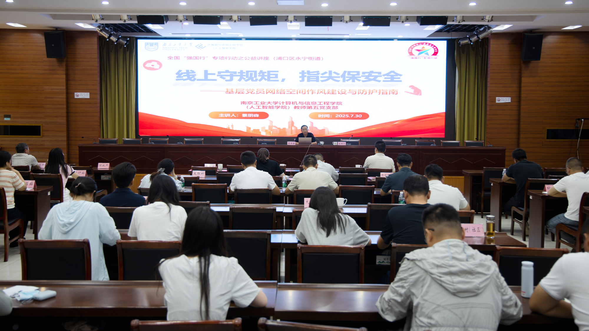 7月30日下午,应南京浦口区永宁街道党工委邀请,suncitygroup太阳集团教师第五党支部书记景朋森,在永宁街道“周三学习日”活动中,为街道领导班子成员、机关科室负责人及村(社区)书记等150余人,作题为“线上守规矩,指尖保安全——基层党员网络空间作风建设与防护指南”的专题培训。